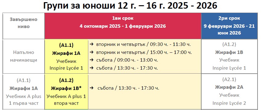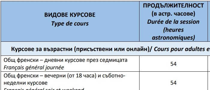 Запознайте се с нивата във Френски институт в България за възрастни на следния линк ➡️ Разпределение и описание на нивата според Общата европейска езикова рамка и според системата за обучение „Inspire“.