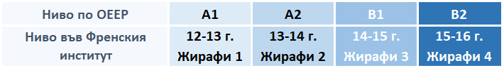 Ако детето Ви е изучавало френски език на друго място, свържете се с нас, за да направи тест за определяне на нивото му. Това ще Ви помогне да изберете група, отговаряща на неговите знания и възраст.