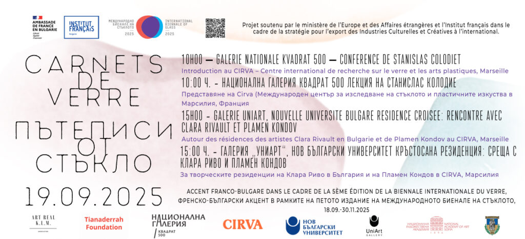 – 10:00 ч. – Лекция на Станислас Колодие – Въведение в CIRVA (Международен център за изследвания в областта на стъклото и изящните изкуства) в Марсилия – Квадрат 500 / Национална галерия (площад Александър Невски / ул. 19 февруари № 1) ;