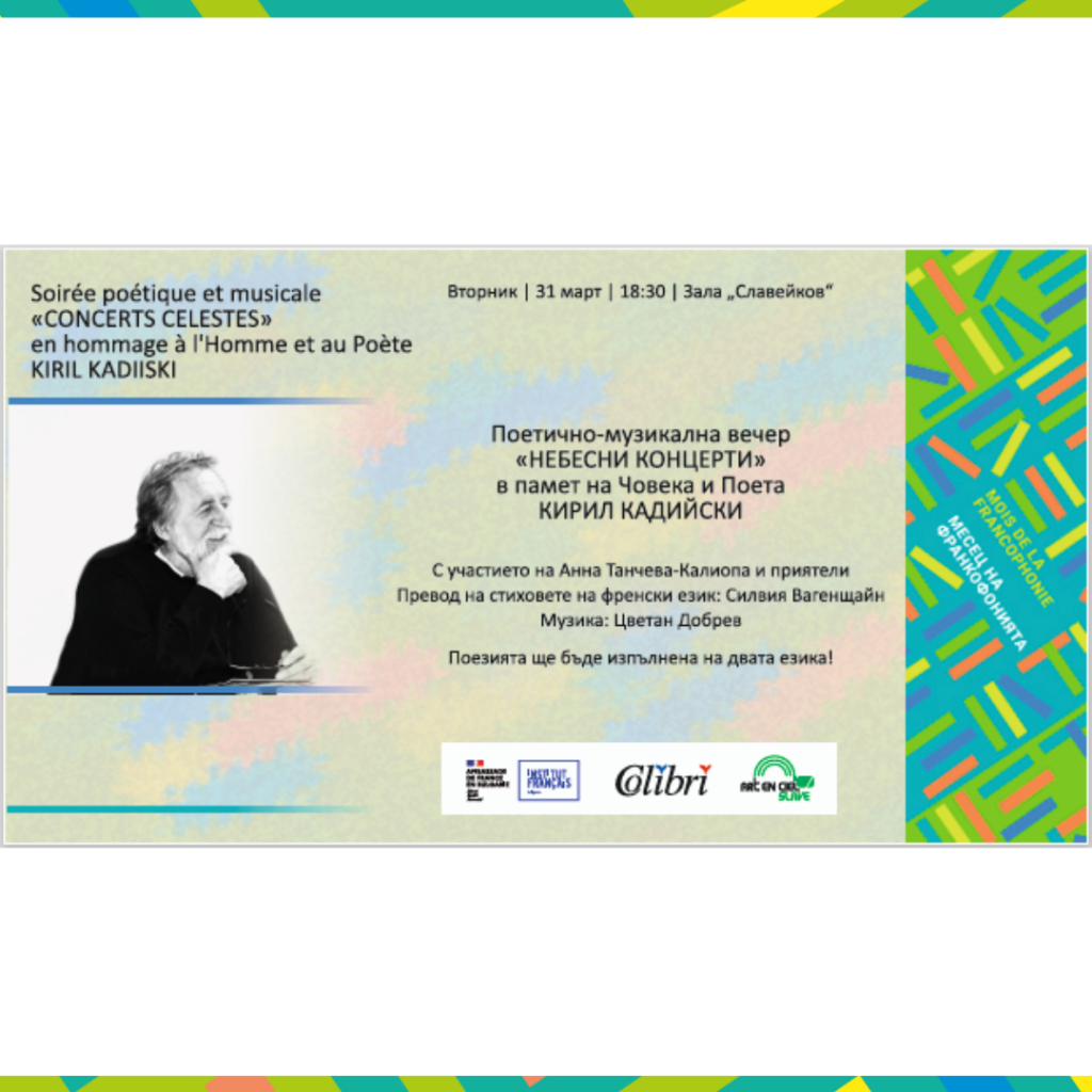 Френският институт в България, издателство COLIBRI и асоциация Art en ciel SLAVE (Париж) Ви канят на поетично-музикална вечер „CONCERTS CELESTES” в чест на човека и поета Кирил Кадийски, във вторник, 31 март, от 18:30 ч., в зала „Славейков”.