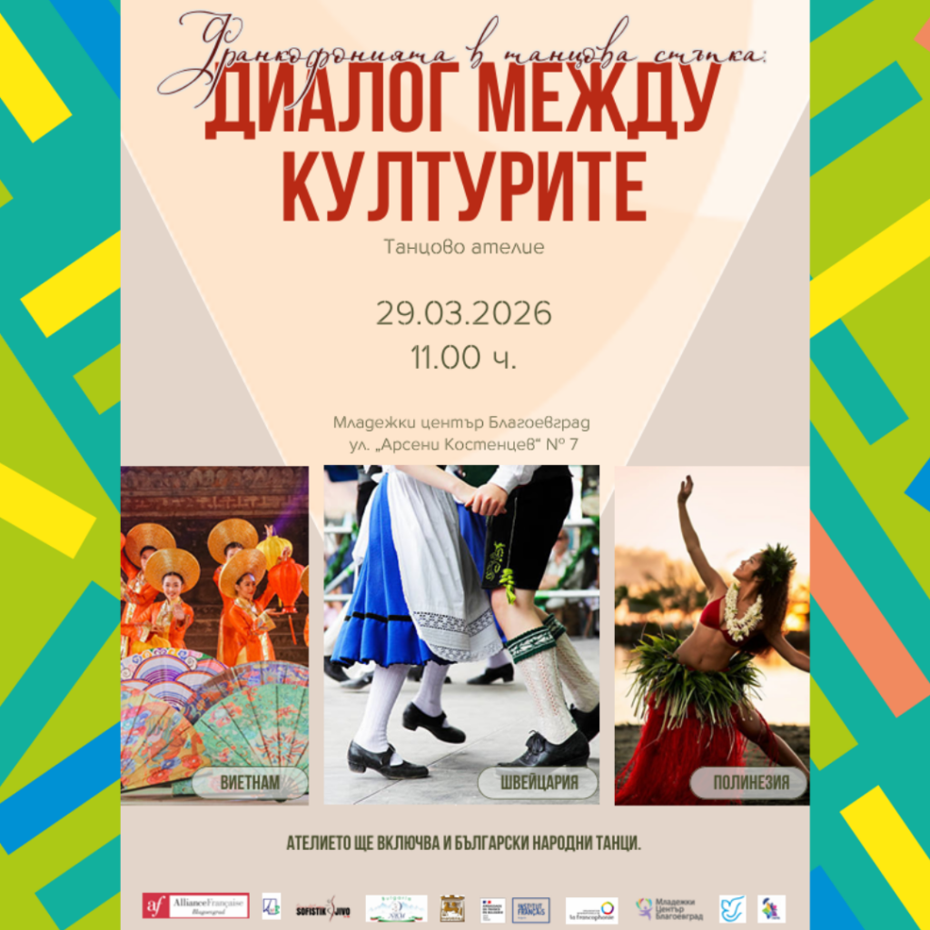 Алианс франсез Благоевград и Асоциацията на преподавателите по и на френски език в България ви канят на танцово ателие. Подарете си едно завладяващо изживяване и нека заедно се потопим в пъстър букет от ритми и култури като скъсим разстоянията с танцова стъпка. Ателието е създадено по оригинална идея и концепция на Елина Топалска и Николета Илчева-Евлогиева, художествени ръководители на Танцова и арт компания „Софистик-Живо”. Ще бъдат представени традиционни танци от Швейцария, Виетнам, Френска Полинезия. Танцово студио „NBM“ще се включи с български танци. Ателието ще се проведе в три модула: Модул 1. Презентация – кратко теоритично запознаване на участниците с етнографско-културния облик на страните, с акцент върху характерните традиции, танцови стилове и етнически особености. Модул 2. Танцова практика – разучаване на фолклорни танци от посочените страни с различна, но достъпна трудност. За участие в ателието не се изисква предишен опит или специална танцувална подготовка. Модул 3. Дискусия – Ателието се организира в в партньорство с Младежки център Благоевград, с подкрепата на Френски институт в България, Международната организация на Франкофонията (CREFECO), Езикова гимназия „Акад. Людмил Стоянов“ и Общински младежки парламент Благоевград. Молим участниците да предвидят удобно облекло, позволяващо свободни движения, и удобни обувки.