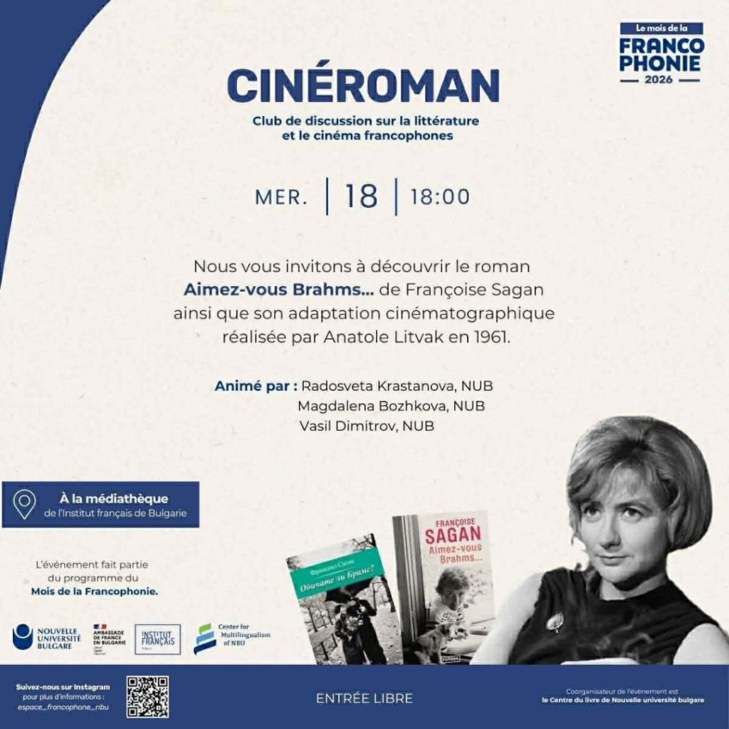 18:00 ч.: Литературна дискусия „Кинороман“ около романа „Нежна песен“ на Лейла Слимани и неговата филмова адаптация. В Медиатеката на Френския институт.