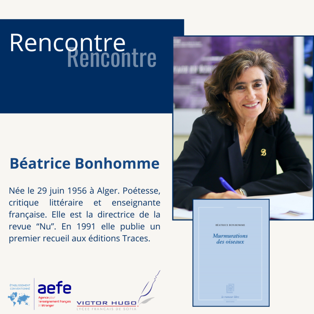 Литературна вечер с нейно участие ще се състои на 21 януари в зала „Славейков“ на Френския институт в България от 18:30 до 20:00 ч. Срещата ще бъде водена от Надежда Московска, като ще бъде осигурен консекутивен превод френски–български. В партньорство с издателство „Прозорец“.
