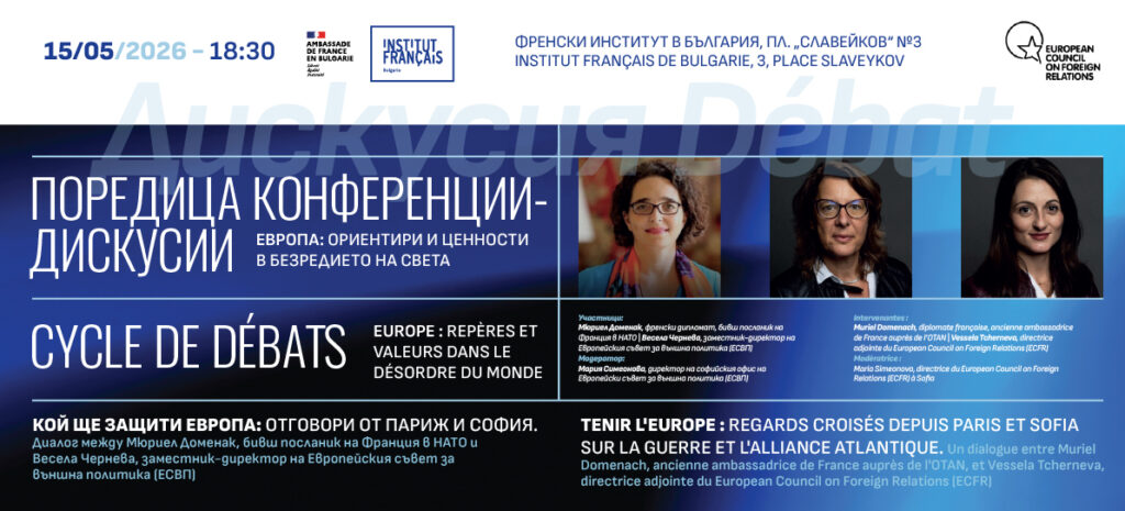 L’Ambassade de France, l’Institut français de Bulgarie et le European Council on Foreign Relations présentent la conférence-débat : « Tenir l’Europe : regards croisés depuis Paris et Sofia sur la guerre et l’Alliance atlantique». Un dialogue entre Muriel Domenach, ancienne ambassadrice de France auprès de l’OTAN, et Vessela Tcherneva, directrice adjointe du European Council on Foreign Relations (ECFR).