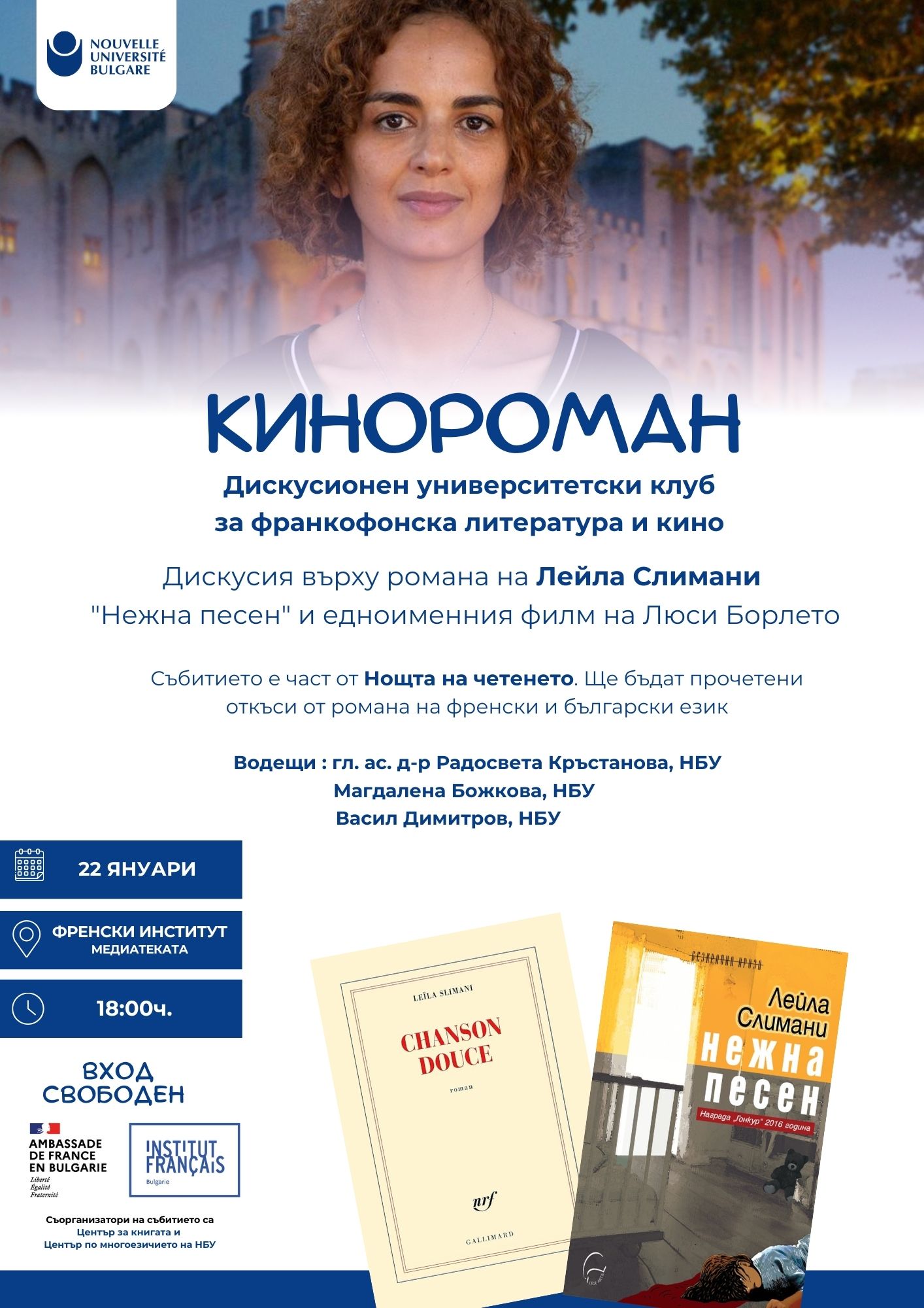 Френският институт в България и Нов Български Университет имат удоволствието да ви поканят на среща на клуба КИНОРОМАН, посветена на романа „Нежна песен“ от Лейла Слимани и неговата филмова адаптация, режисирана от Люси Борлето.