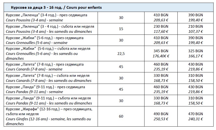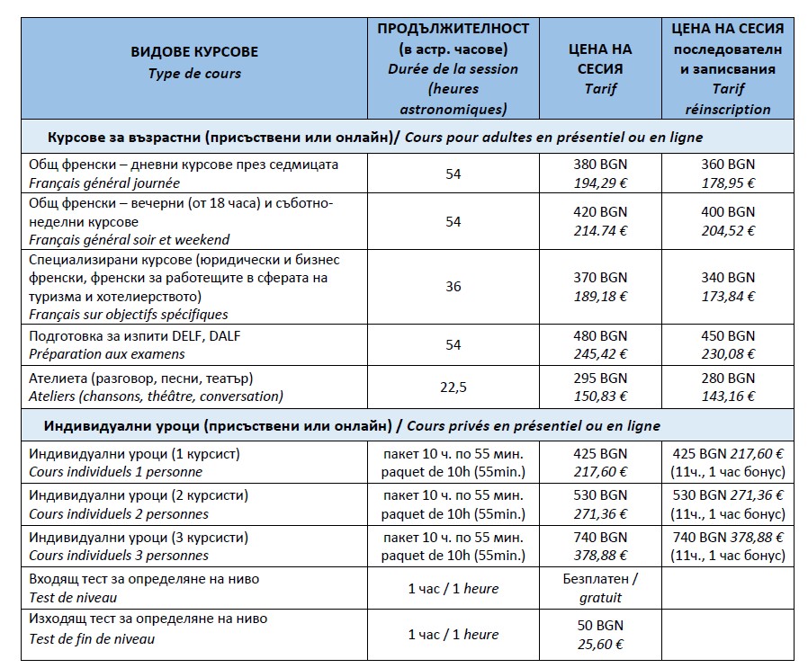Цени от 1 септември 2025 г. (в лева) за присъствена и дистанционна форма на обучение