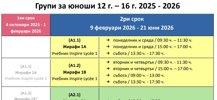 График курсове 2025/2026 – 2ри срок тийнейджъри 12г.-16г.